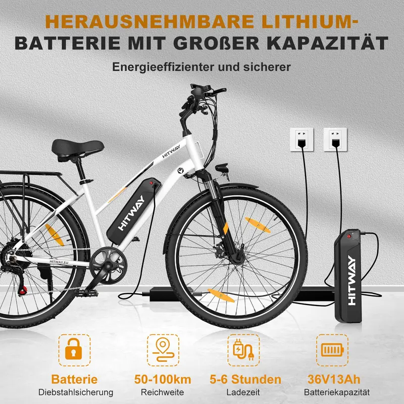 • AUSGEZEICHNETE FAHRLEISTUNG-Das E-Bike Von HITWAY ist mit einem herausnehmbaren 36V/13Ah Lithium-lonen-Akku und einem 250W- Hochleistungsmotor ausgestattet, der viel Kraft auf die Straβe bringt. Es erreicht eine Hochstgeschwindigkeit von 25km/h und eine maximale Reichweite von 50- 100km (je nach Fahrstil, Gewicht, Straßenbedingungen, Wind, usw.).